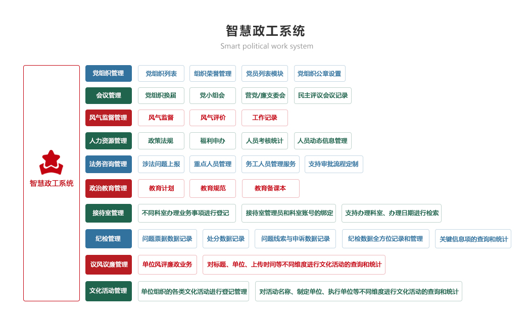 政治教育系統輔助政治機關做好人員思想常掌握、政治教育全覆蓋、人才培養見成效和黨建工作更務實,特別是依托新媒體,在手機上開展移動政治工作,激發官兵參與互動,主要包括人力資源、 組織建設、政治教育和保衛工作功能。